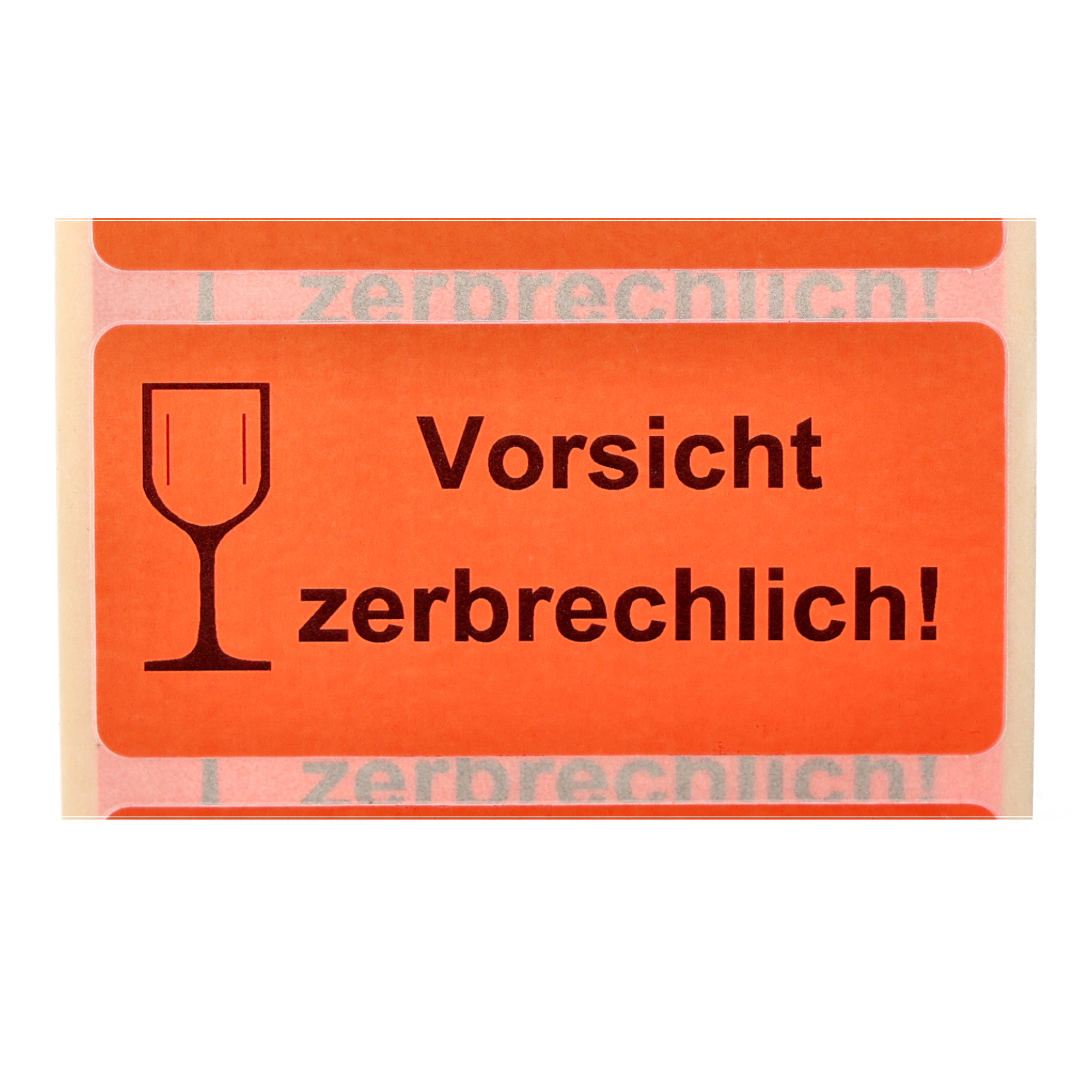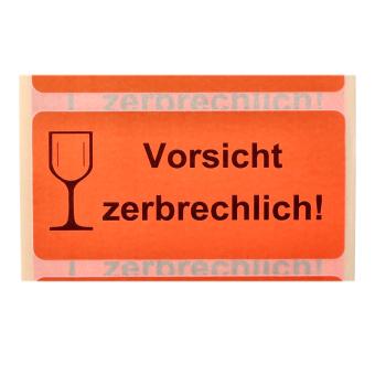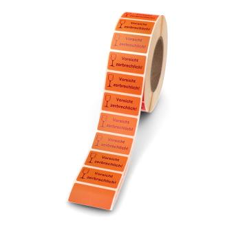 Versandaufkleber Vorsicht - zerbrechlich auf selbstklebendem Papieretikett. Wahlweise in den Farben leuchtrot, leuchtgelb, leuchtgrün oder weiß. Die Signalfarben unserer Versandaufkleber stechen sofort ins Auge.