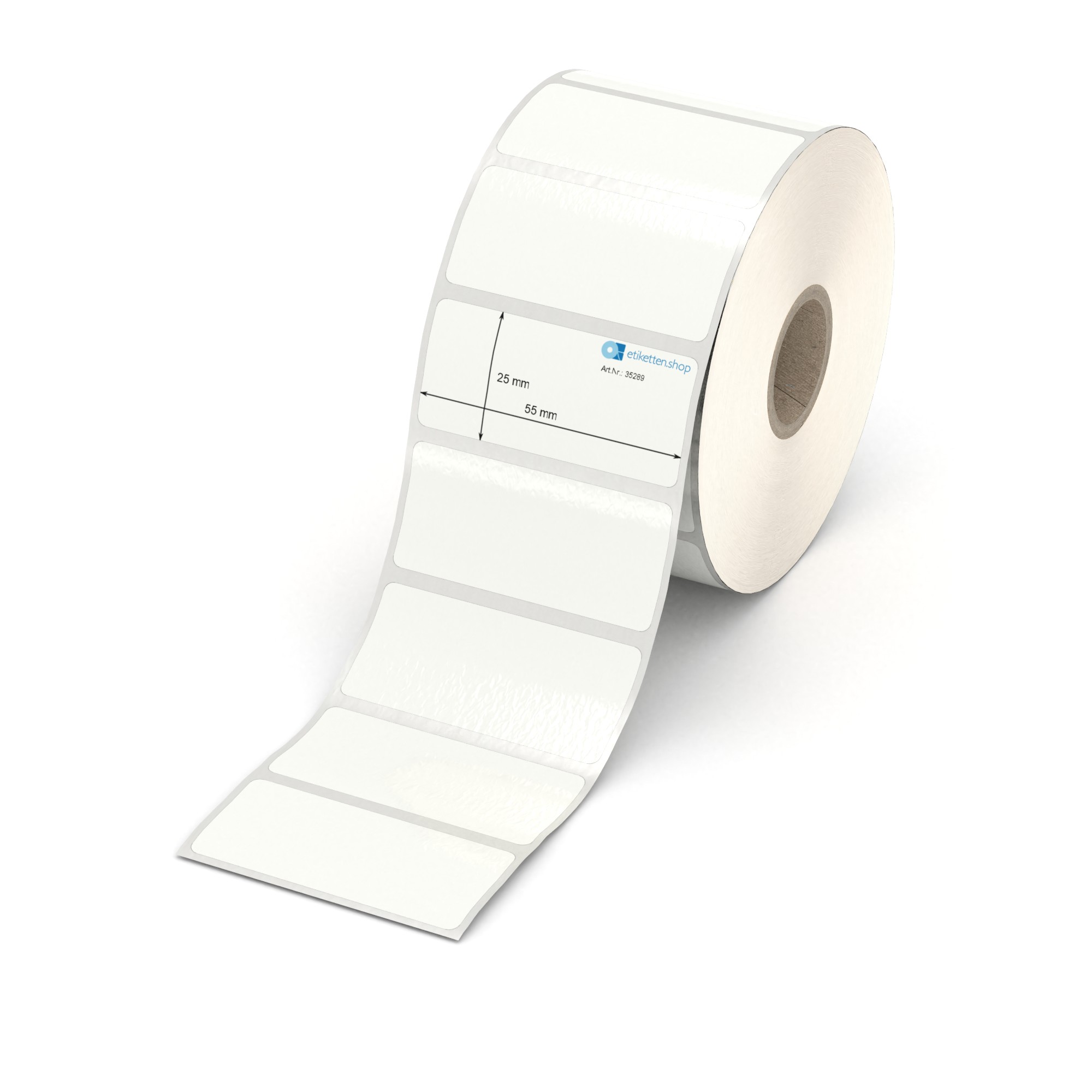 Etikett 55 x 25 mm - PE-Folie weiß permanent - 1300 Etiketten pro Rolle - 25 mm Hülse