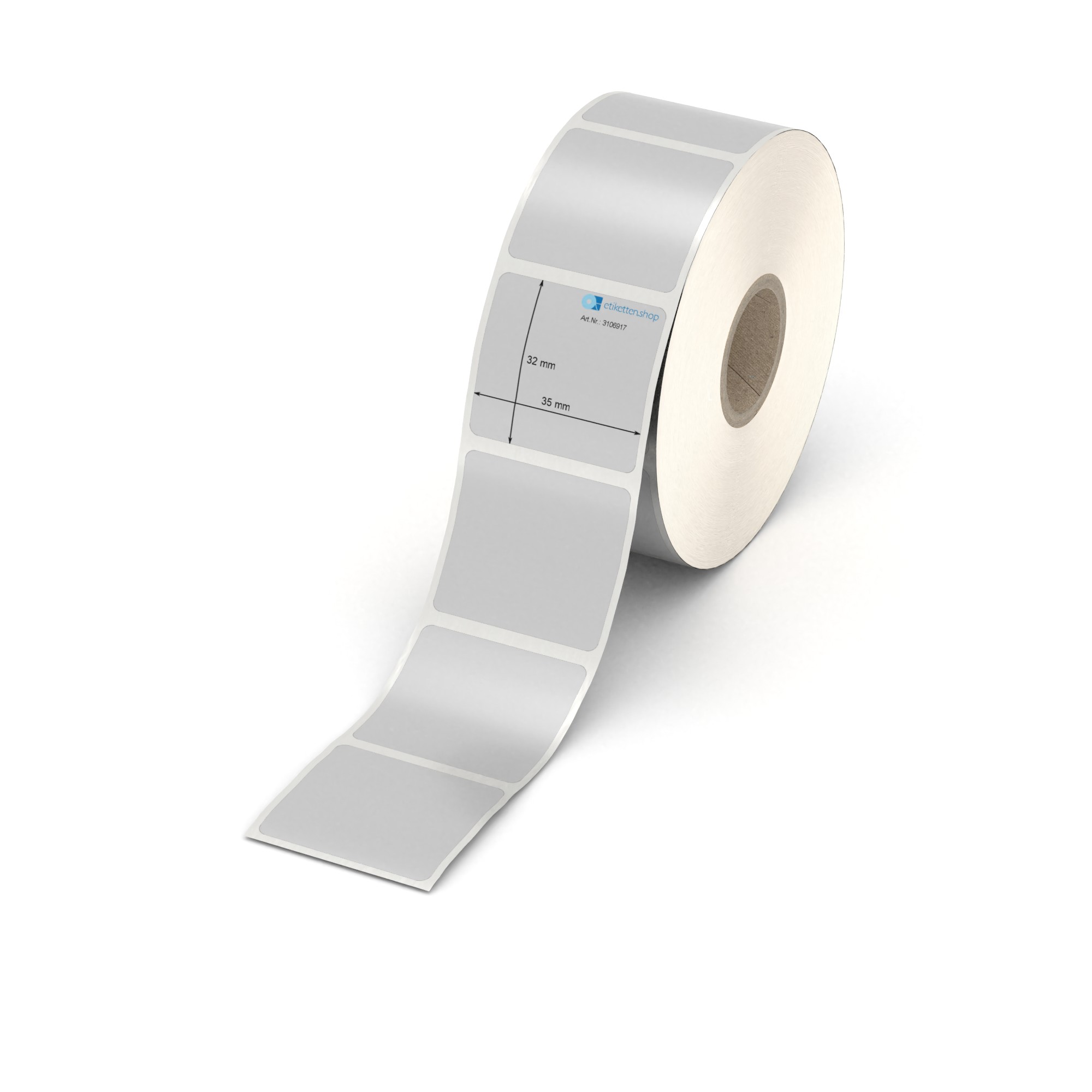Etikett 35 x 32 mm - Polyester silbern permanent - 1100 Etiketten pro Rolle - 25 mm Hülse