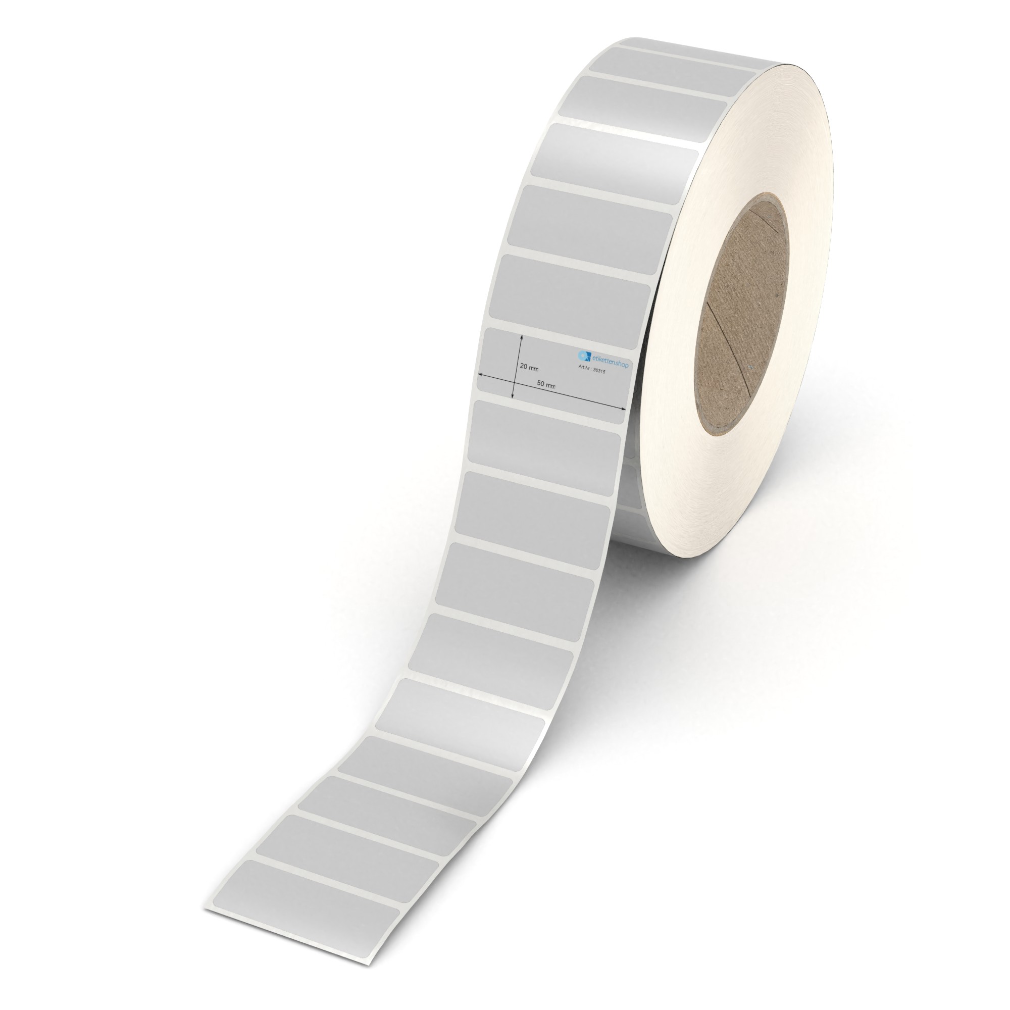 Etikett 50 x 20 mm - Polyester silbern permanent - 5000 Etiketten pro Rolle - 76 mm Hülse