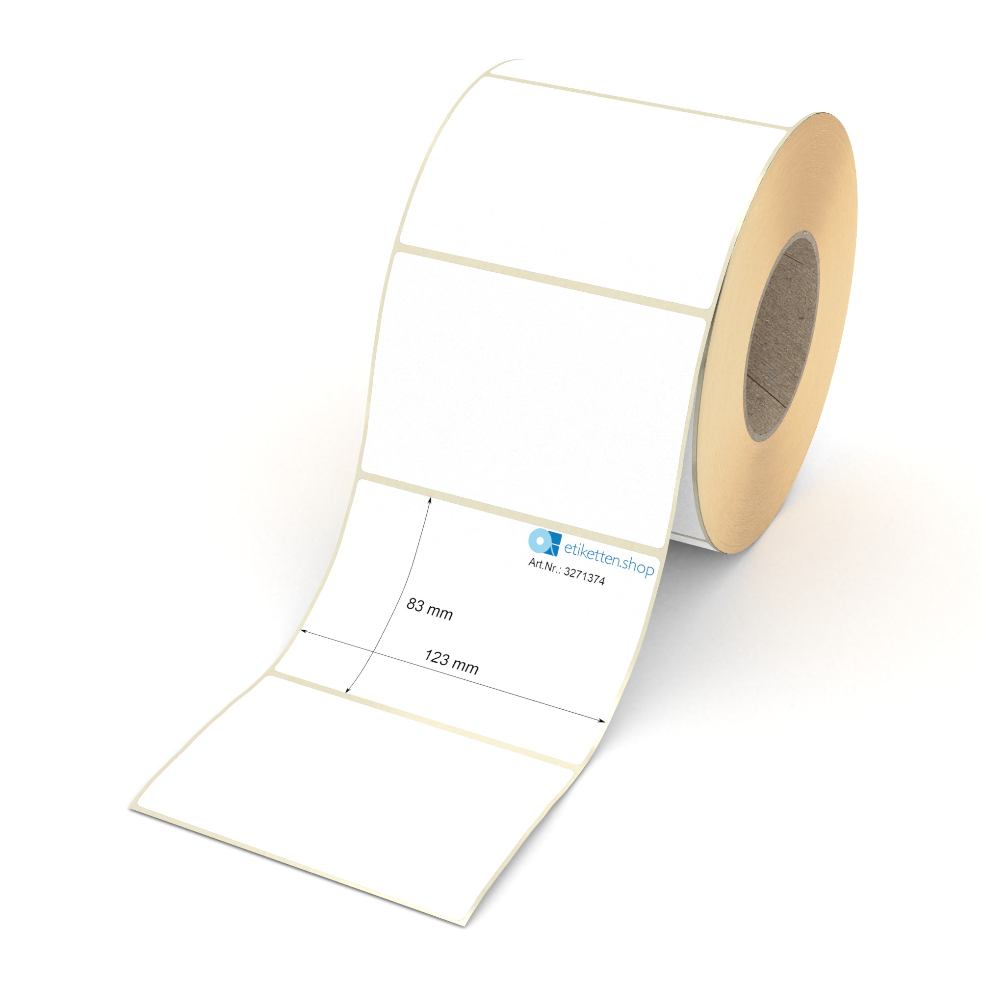 Etikett 123 x 83 mm - Thermopapier weiß leicht ablösbar - 1300 Etiketten pro Rolle - 76 mm Hülse